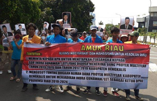 Puluhan massa yang terdiri dari Mahasiswa dan Masyarakat itu, dalam aksinya mendesak, agar KPK segera memeriksa mantan Wakil Ketua DPRD Bengalis Periode 2014-2019 atas nama Indra Gunawan Eet yang saat ini terpilih menjadi Ketua Dewan Perwakilan Rakyat Daerah (DPRD) pada Pileg 2019 terkait kasus dugaan korupsi Proyek Multi Year Tahun 2013-2015 dan tahun 2017-2019 di Kabupaten Bengkalis, Riau.