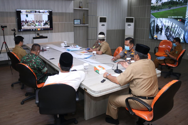 Bupati Siak Alfedri didampingi Forkopimda Kabupaten Siak, melaporkan sejumlah langkah penanganan merebaknya penyebaran Wabah Covid-19 atau Virus Corona di Kabupaten Siak, melalui video conference kepada Gubernur Riau Syamsuar dan Wakil Gubernur Riau Edi Natar Nasution dari Ruang Command Center Siak Live Room di Ruang Bandar Serai Kantor Sekretariat Daerah pada Senin, 23 Maret 2020.