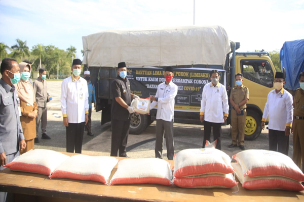 Lewat Bupati Siak, Komisioner Baznas Kabupaten, menyalurkan Bantuan Lima Bahan Pokok (Limbako) kepada kaum mustahik, Duafa dan keluarga kurang, mampu terutama terdampak musibah Non Alam Virus Corona, melalui UPZ Kecamatan dan melalui Camat Senin 13 April 2020 di halaman kantor Bupati Siak.