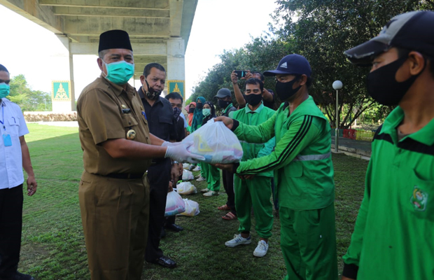 Bantuan sembako sederhana itu, diserahkan secara simbolis oleh Bupati Siak Alfedri kepada BHL Kebersihan di Siak, yang dilaksanakan di taman Tengku Agung, Kecamatan Siak, Selasa (12/5/2020).
