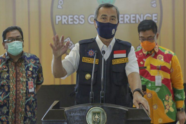 Gubernur Riau H Syamsuar dalam konferensi persnya Kamis 28 Mei 2020 di Posko Gugus Tugas Penanggulangan Covid-19 Provinsi Riau Pekanbaru.