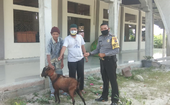 Polsek Buktit Raya melalui Bhabinkamtibmas Kekurahan Tangkerang Barat, Aiptu Desril Arifin, menyerahkan seekor kambing ke Masjid Nurul Jannah di Jalan Pias RT04 RW 08 Kelurahan Tangkerang Barat, Kecamatan Marpoyan Damai Kota Pekanbaru.