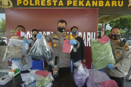 Kapolresta Pekanbaru Kombes Pol H. Nandang Mumin Wijaya, S.I.K, M.H saat menggelar Konferensi Pers pengungkapan pembunuhan wanita di kamar hotel di Mapolresta Pekanbaru, Kamis (24/9/2020)).