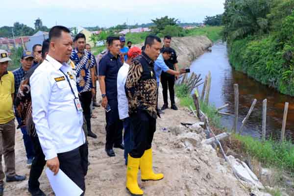 Penjabat (Pj) Wali Kota Pekanbaru Muflihun bersama rombongan instansi terkait, pantau penambalan jalan rusak di Jalan Delima dan Peninjauan perumahan rawan banjir pada Kamis 2 Juni 2022 di Kelurahan Sungai Sibam, Kecamatan Binawidya.