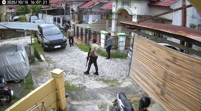Tangkapan Layar CCTV milik orang tua JS, saat Tim RAGA (Riau Anti Geng dan Anarkisme) bersama Unit IV Subdit Jatanras Ditreskrimum Polda Riau mendatangi kediaman pribadi orangtuanya serta melakukan penggeledahan pada Selasa (14/10/2025) sore. (FT: Istimewa)
