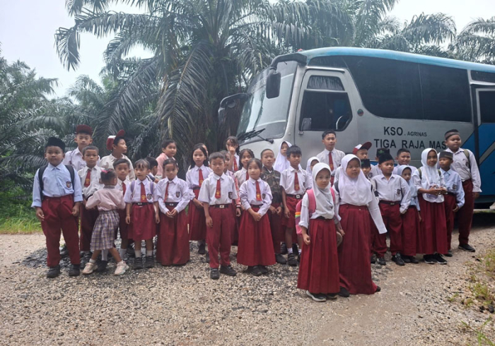 INHU - Komitmen PT. Tiga Raja Mas dalam membantu masyarakat kembali dibuktikan melalui penyediaan bus sekolah gratis bagi anak-anak di Dusun Kayu Kawan, Desa Sungai Akar Indragiri Hulu.