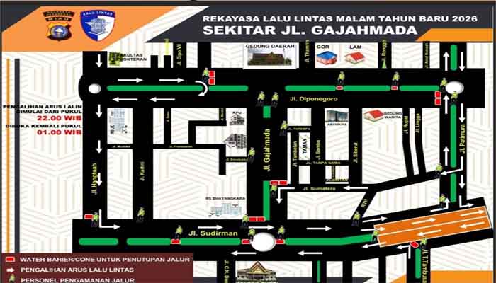 PEKANBARU, Oketimes.com - Sejumlah ruas jalan utama di Kota Pekanbaru akan dilakukan penutupan dan pengalihan arus lalu lintas pada malam pergantian Tahun Baru 2026. Kebijakan ini diterapkan untuk menjaga kelancaran arus kendaraan serta menjamin keamanan dan ketertiban masyarakat selama perayaan tahun baru.