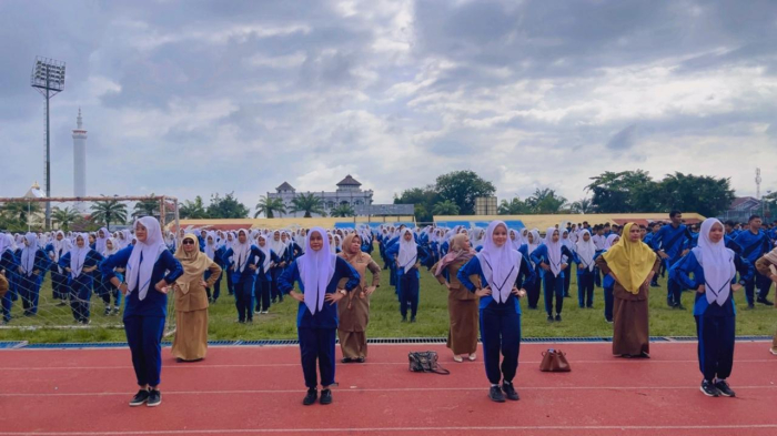 Para siswa UPT SMP Negeri 1 Bangkinang Kota mengikuti Senam Anak Indonesia Hebat yang dilaksanakan di Stadion Tuanku Tambusai.(Foto: Ist)
