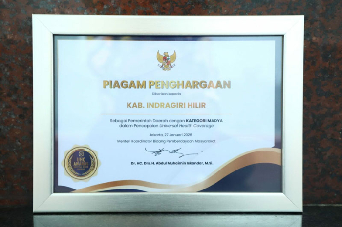 JAKARTA - Pemerintah Kabupaten (Pemkab) Indragiri Hilir kembali meraih Penghargaan Universal Health Coverage (UHC) Awards 2026 Kategori Madya, Selasa (27/01/206). Penghargaan diterima atas capaian kepesertaan jaminan kesehatan masyarakat, setelah pada tahun sebelumnya meraih Penghargaan Pratama.