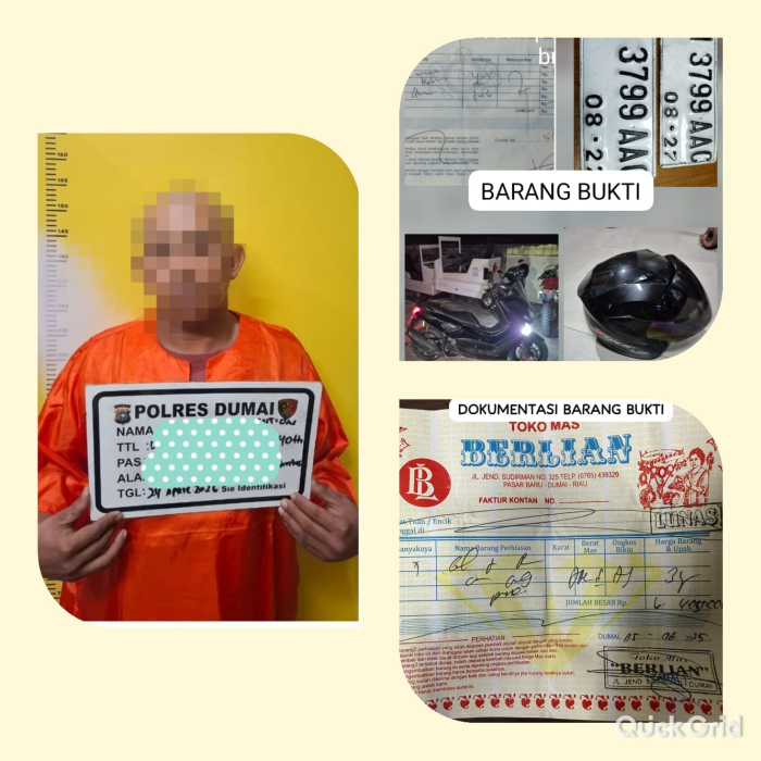 Dari hasil penyelidikan, polisi mengidentifikasi pelaku berinisial A. Tim opsnal kemudian berhasil mengamankan pelaku pada 24 April 2026 sekitar pukul 20.40 WIB di wilayah Kelurahan Purnama, Kecamatan Dumai Barat tanpa perlawanan.